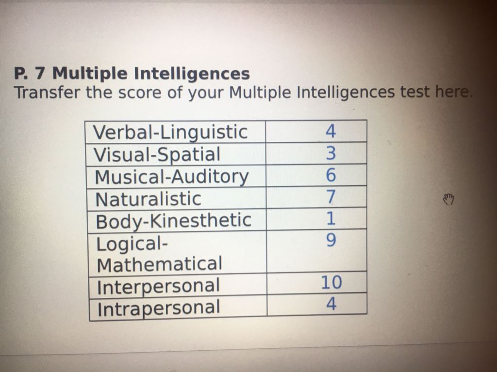 The first two activities I took part in were The Multiple Intelligence Quiz and Learning Style Quiz. According to the result of The Multiple Intelligence Quiz, Interpersonal intelligence and Logical-intelligence was my natural talent. Because of my Interpersonal intelligence, I can reflect on my strengths and identify my potential as a leader in my community, which often refers to my class. However, the result surprised me because I hadn’t realized that Logical-intelligence was my natural talent. I used to regard that a person like me who disliked math would not have Logical-intelligence however, I fit many of the characteristics of the options in the Logical-intelligence section, which means it was exactly my natural talent. This quiz gave me important information about myself like what my natural talent was as well as some information that I haven’t realized before by investigating my likes, dislikes, strengths, weakness, hinting which career I might fit in the future. In the future, I will continue to develop new abilities and strengths to help me meet new challenges. The result of Learning Style Quiz helped me identify my strongest learning styles, which was Visual learning style, roughly in line with my own predictions.
